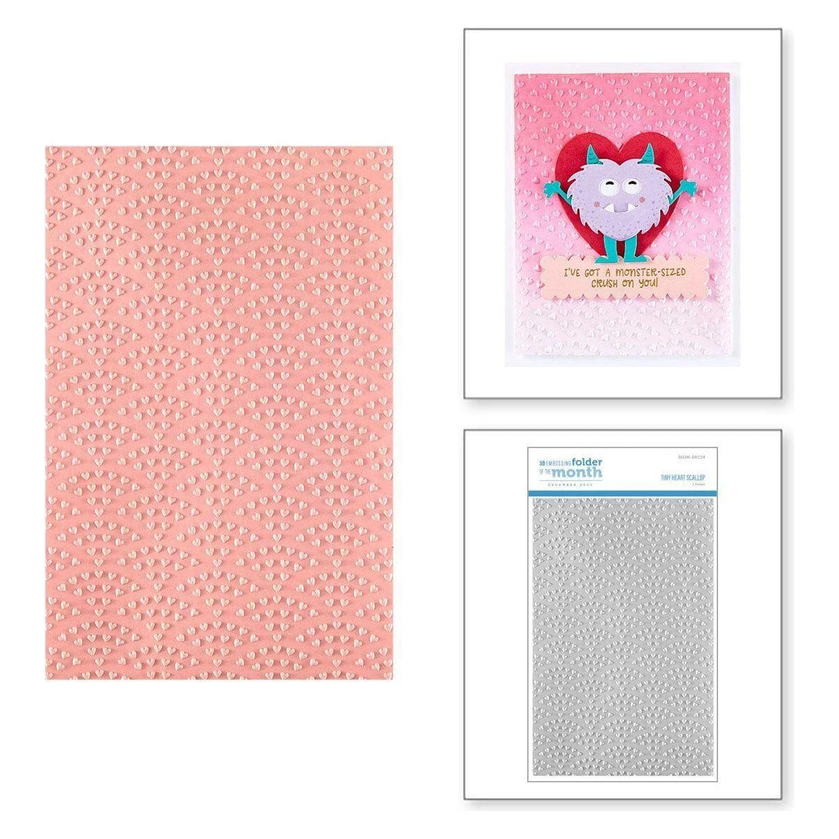 Tiny Heart Scallop 3D Embossing Folder of the Month released December 2024 to our Embossing Folder of the Month Club. This large embossing folder can make slimline, 5″ x 7″, and a variety of sized projects. Perfect for adding even more texture and dimension to your card projects.
