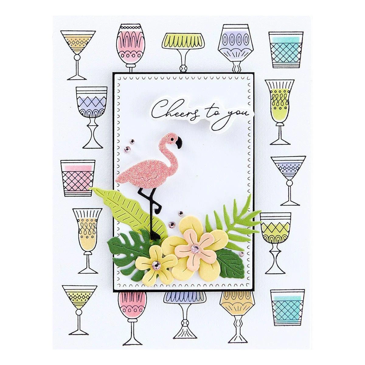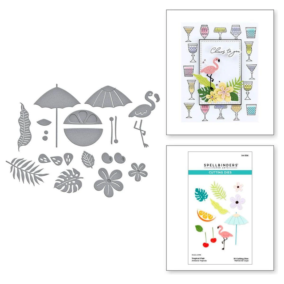 Tropical Flair Etched Dies are part of the Happy Hour Collection. This set of 15 thin metal cutting dies have so many fun designs for everything tropical! It includes florals, leaves, flamingo, citrus and even an umbrella to add to drinks! Mix and match with the other sets in the collection for a festive vibe!