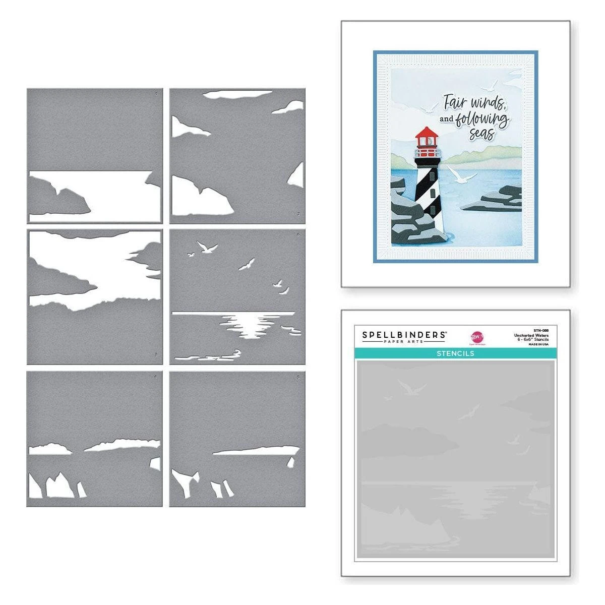 Uncharted Waters Layering Stencil is part of the Fair Winds Collection by Dawn Woleslagle. This fun stencil has 6 different layers to create the perfect seaside scene for all the dies in this collection. Use all six layered together to make an ocean with rocky shores and a sky full of gulls, or use individual parts to make just a shoreline. The choice is yours!
