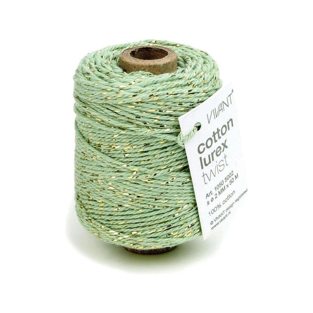 Lurex Nile/Light Olive Cotton Cord by Vivant is a versatile and stylish crafting material that will add a touch of sophistication to any project. This spool of cord contains 54.68 yards of cotton thread infused with metallic lurex in a chic and modern light olive color. 70% Cotton, 30% Lurex