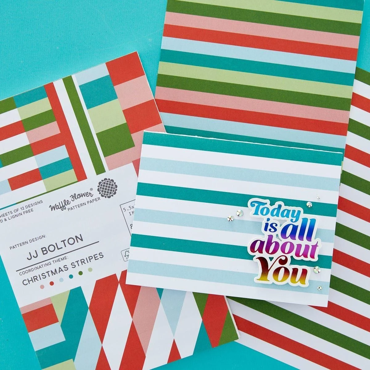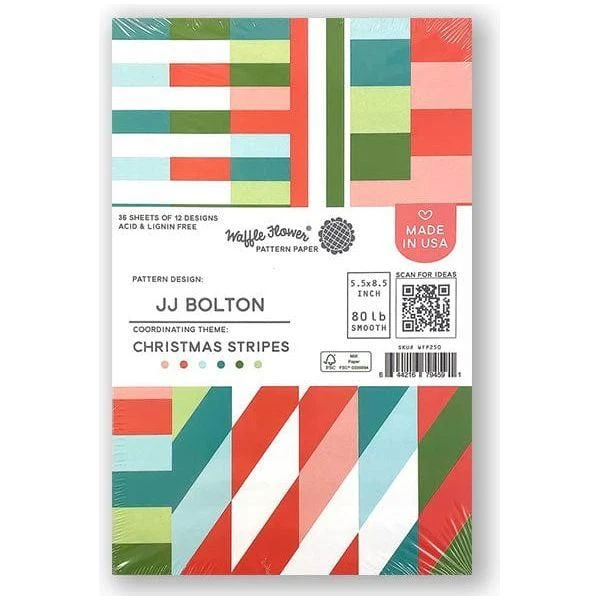 Waffle Flower Christmas Stripes Paper Pad 5.5″ x 8.5″ – 36pk: Printed on 80lb smooth premium cardstock; 3 sheets each of 12 coordinating designs with each page measures 5.5″x 8.5″. Padded at top; individually shrink-wrapped. Made in USA.
