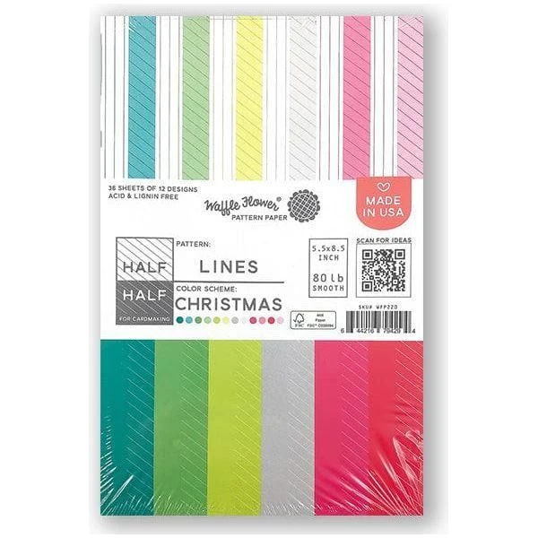 Waffle Flower Half-Half Lines – Christmas Paper Pad 5.5″ x 8.5″ – 36pk: Printed on 80lb smooth premium cardstock; 3 sheets each of 12 coordinating designs with each page measures 5.5″x 8.5″. Padded at top; individually shrink-wrapped. Made in USA.