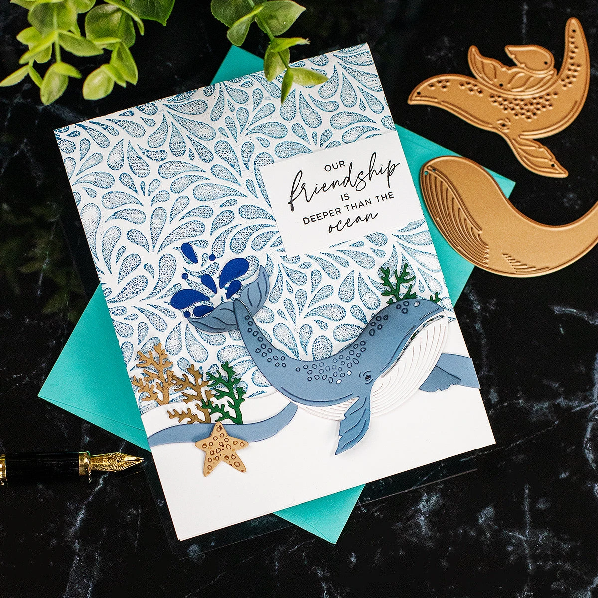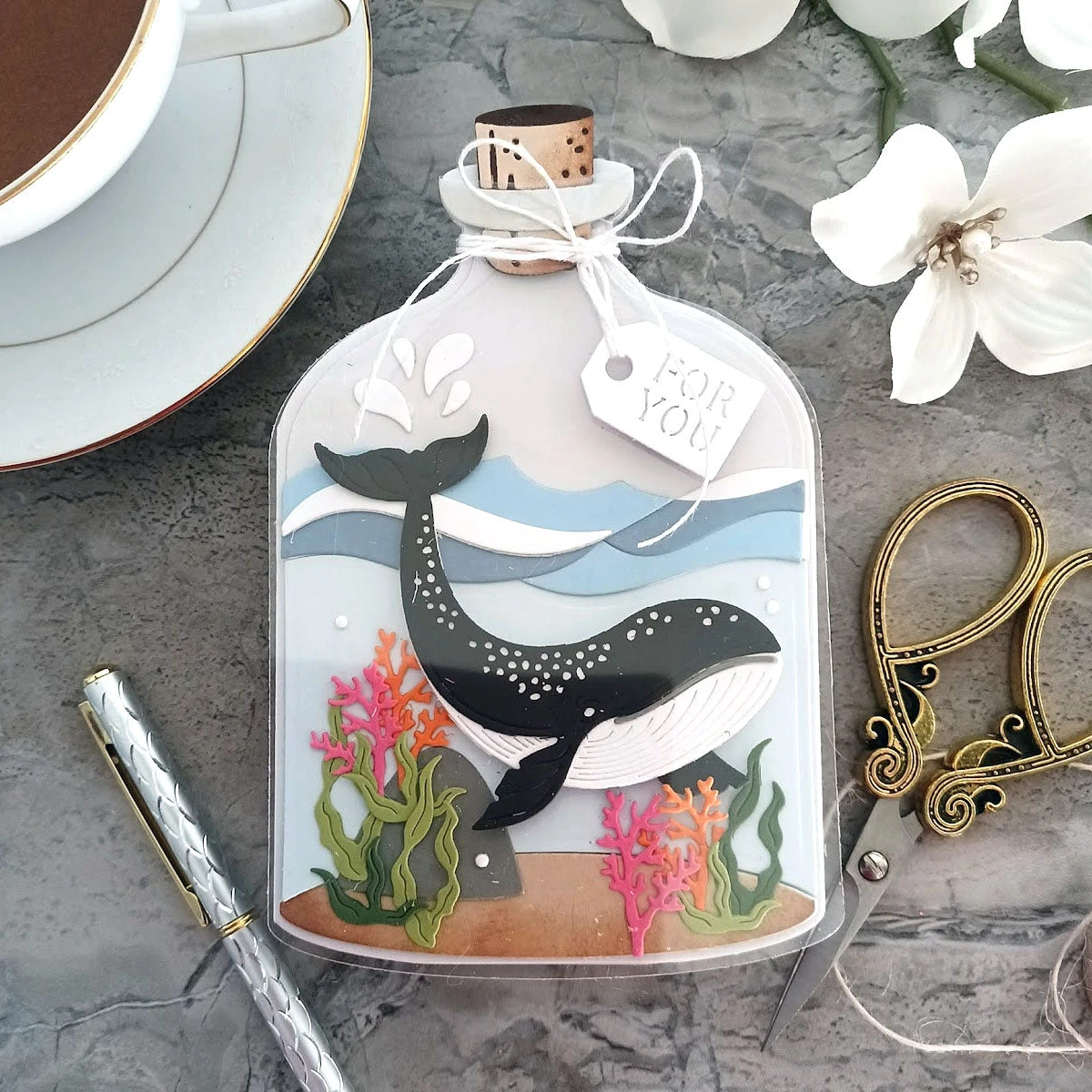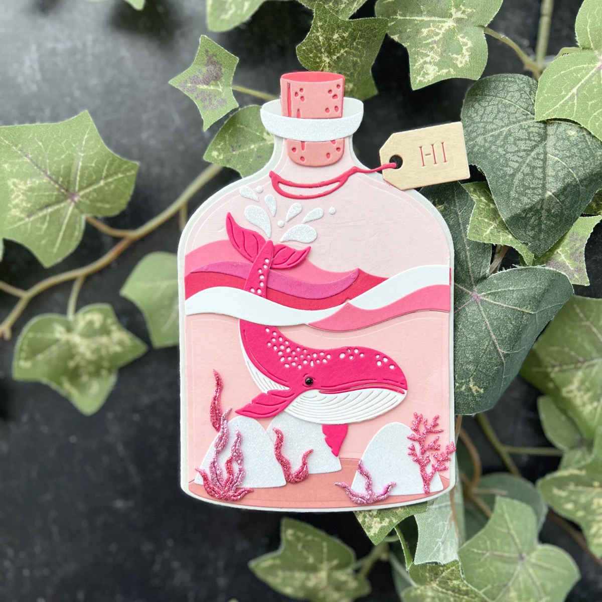 Whale in a Bottle – Large Die of the Month this 20-piece Die Set, cuts, embosses, debosses, and stencils. Released June 2023 to our Large Die of the Month Club creates a whale in a bottle design.