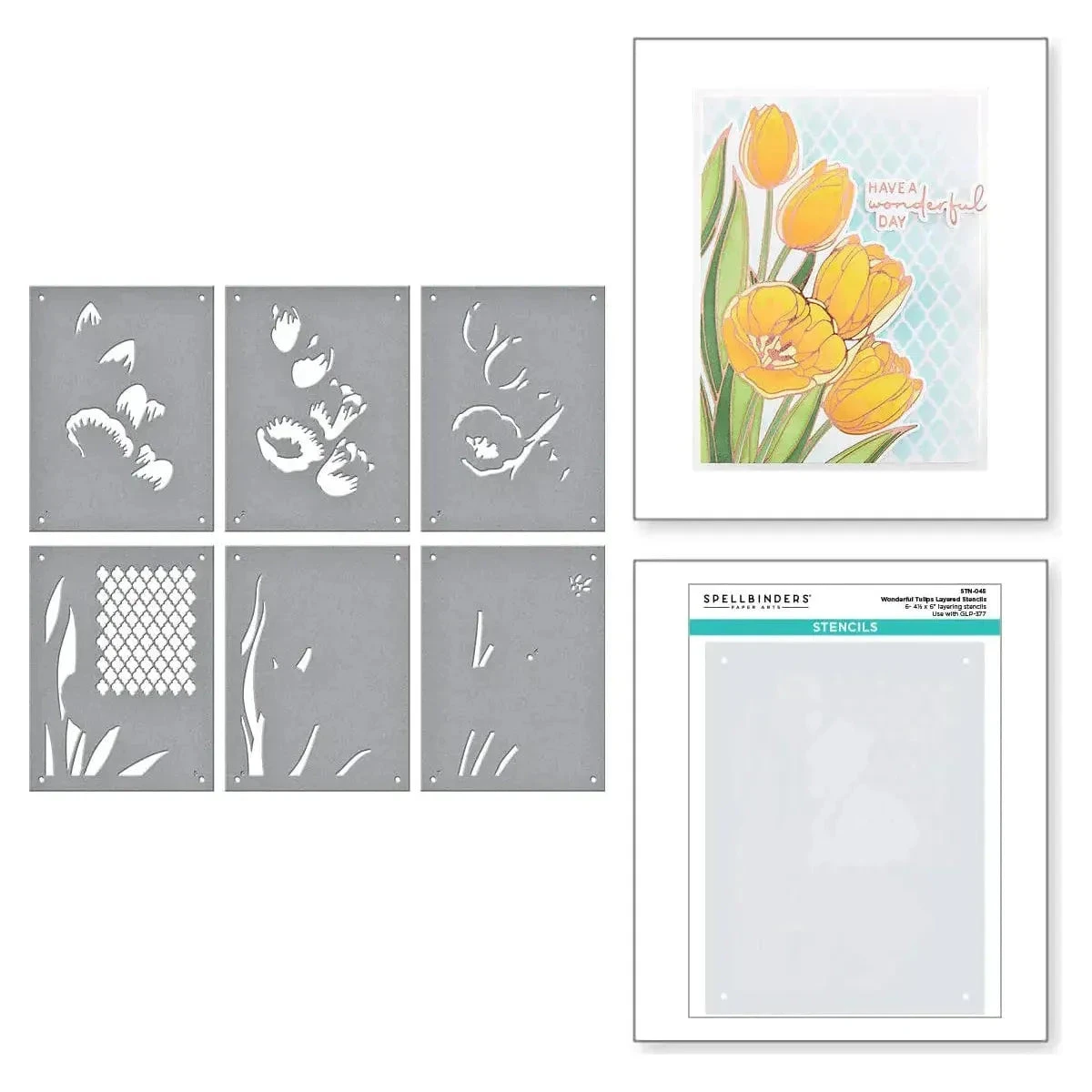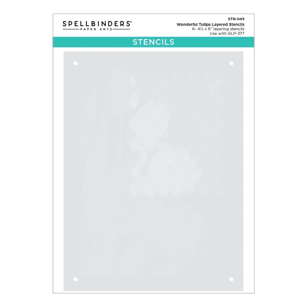 Wonderful Tulips Layered Stencils are part of the Four Petal Collection and are made of durable mylar stencil material. The six stencil sheets are designed to work with GLP-377 Wonderful Tulips Glimmer Hot Foil Plate & Die Set.