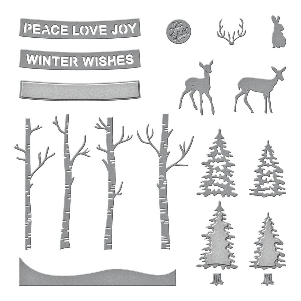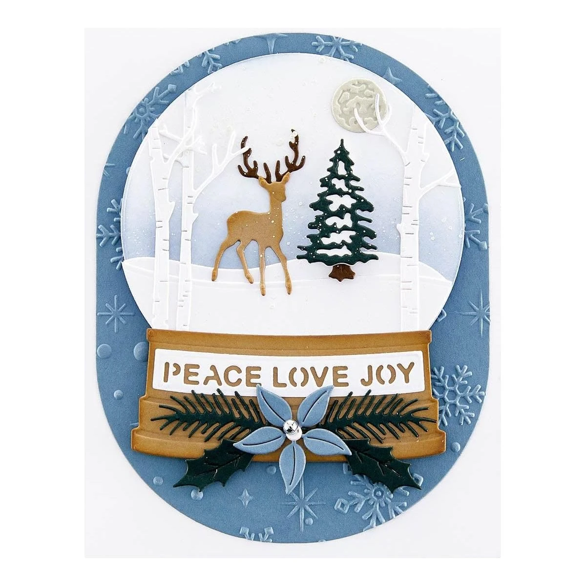 Woodland Scene Etched Dies are part of the Simon’s Snow Globes Collection by Simon Hurley. Designed to work with S6-222 Simon’s Snow Globe Etched Dies, this set of 15 thin metal cutting dies adds a woodland scene to the ensemble. It includes tall Birch Trees, deer, evergreen trees and more. There are two sentiments in the set, Winter Wishes and Peace Love Joy. Mix and match with other scene sets in the collection!