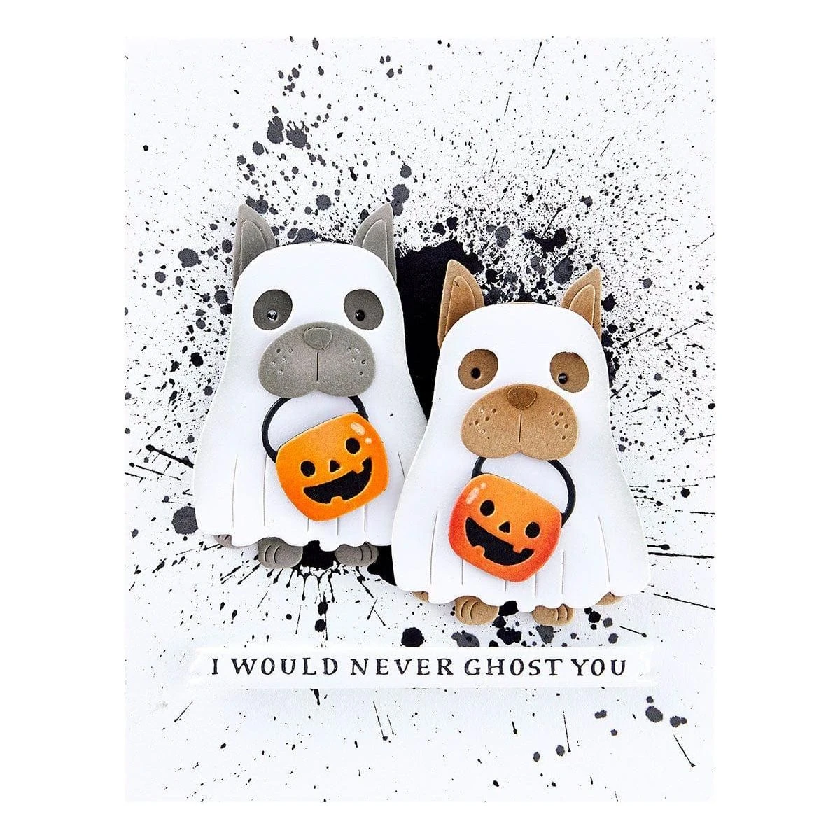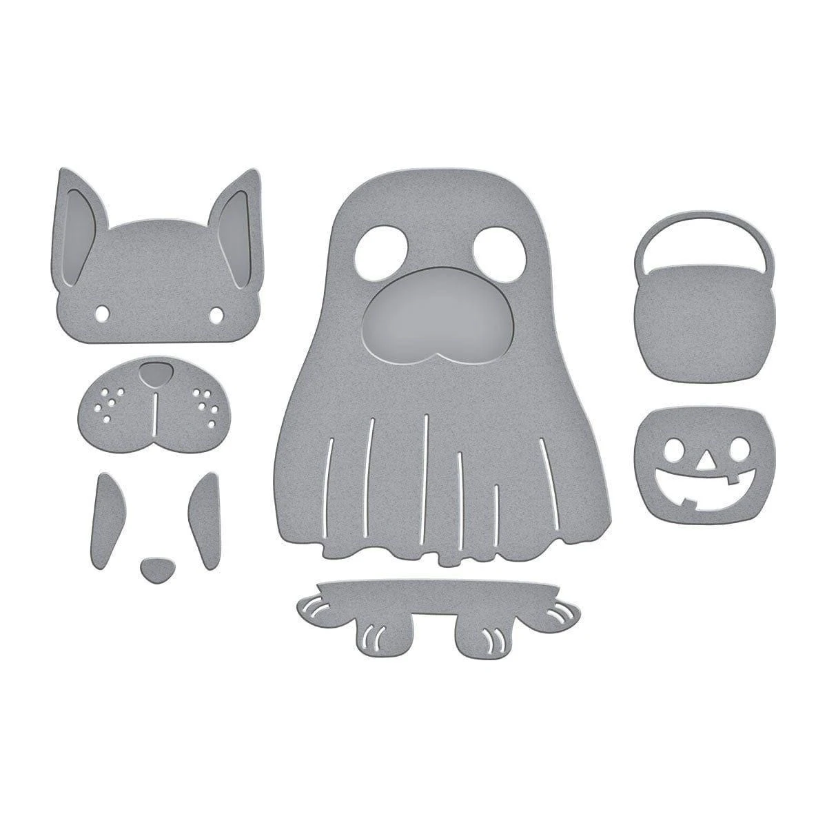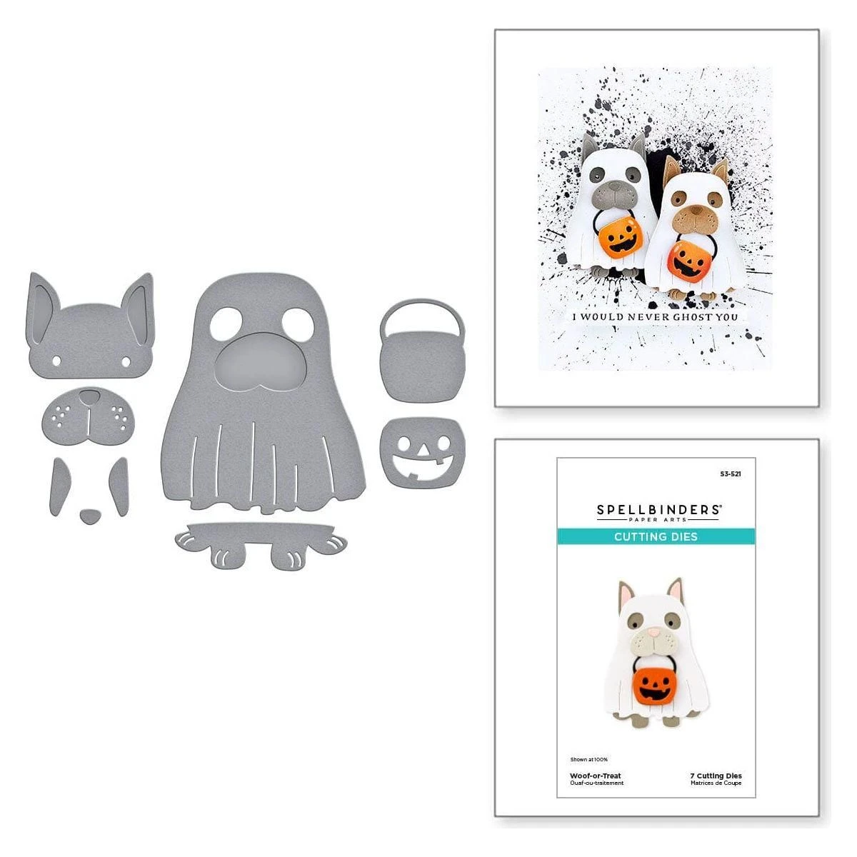Woof-or-Treat Etched Dies are part of the Happy Haunting Collection. How can you resist this sweet ghost pup asking for treats? When assembled, it makes an adorable trick-or-treater with its ears, nose and paws sticking out of a ghost costume…pumpkin treat bucket included!