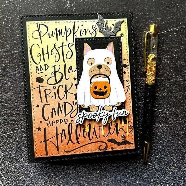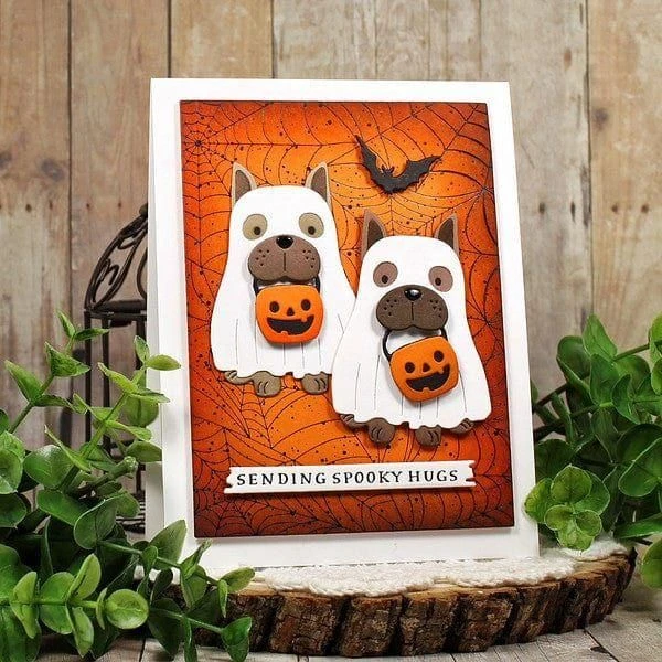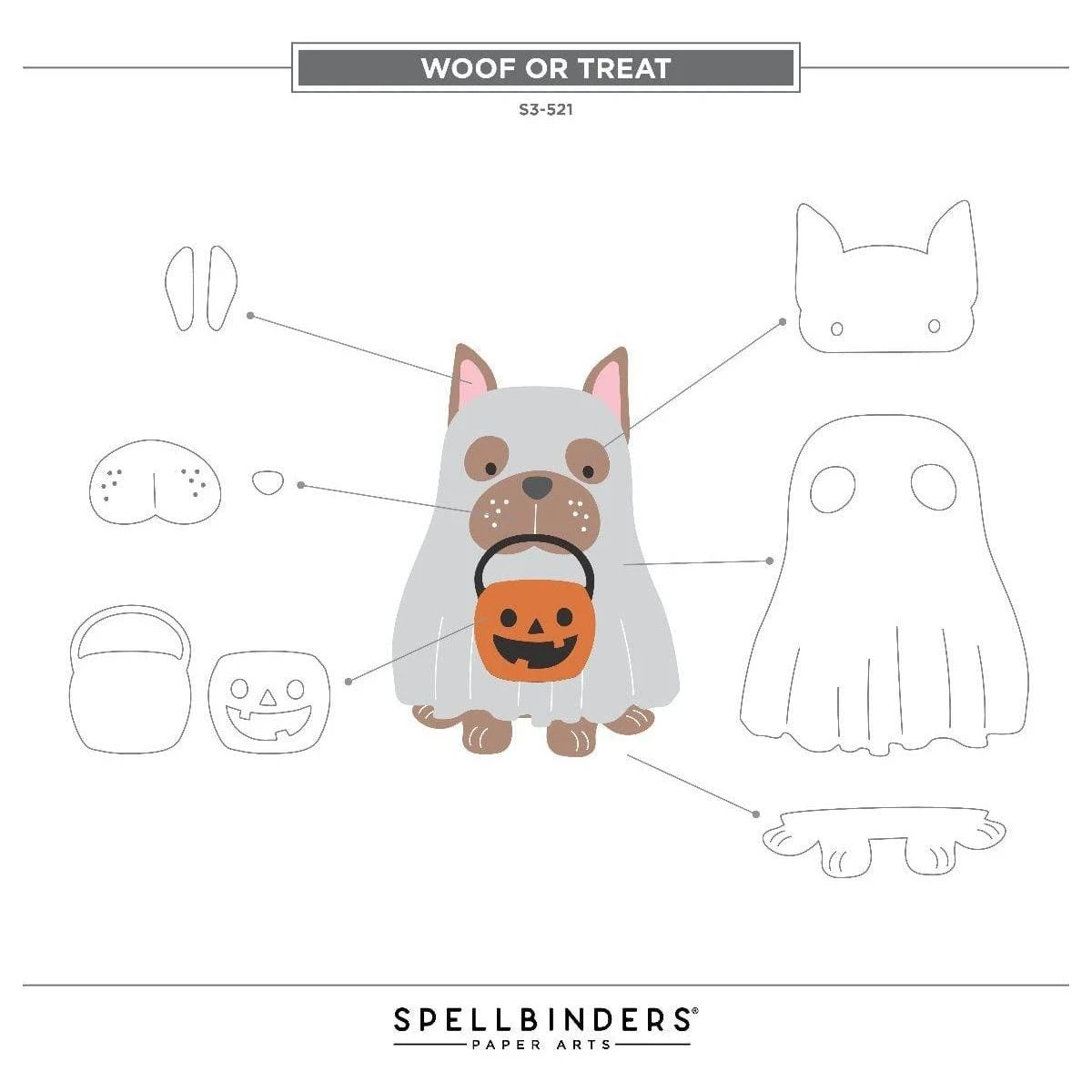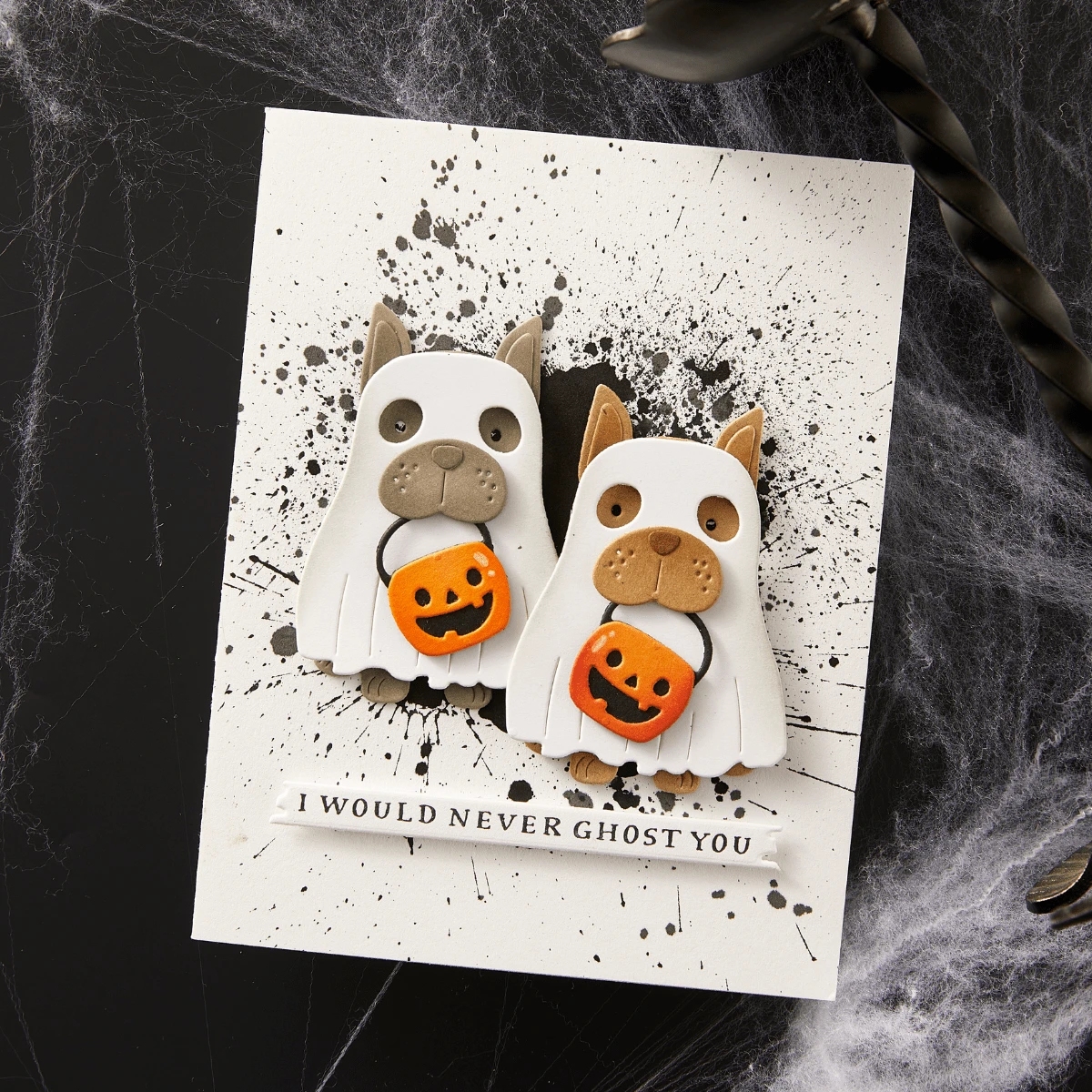 Woof-or-Treat Etched Dies are part of the Happy Haunting Collection. How can you resist this sweet ghost pup asking for treats? When assembled, it makes an adorable trick-or-treater with its ears, nose and paws sticking out of a ghost costume…pumpkin treat bucket included!