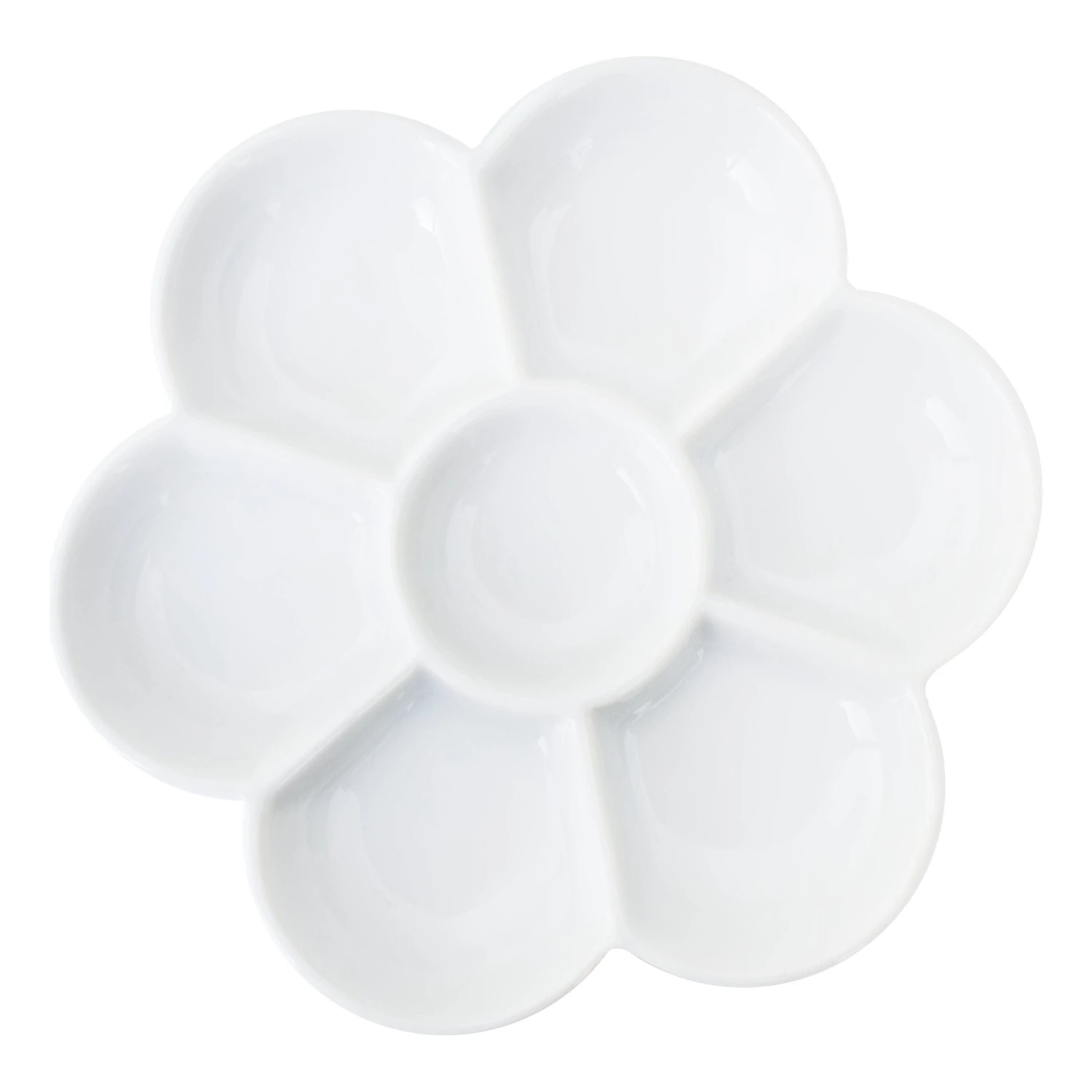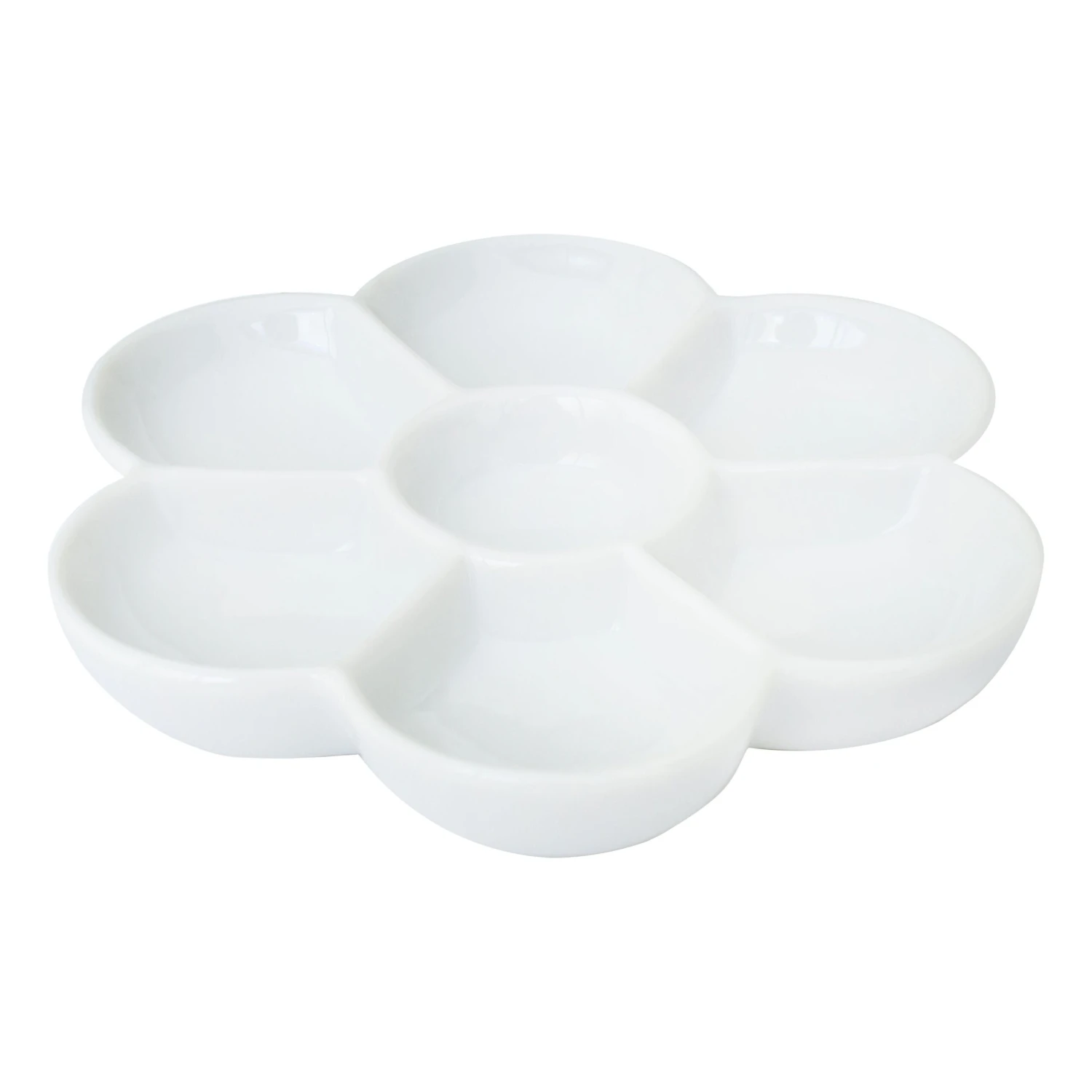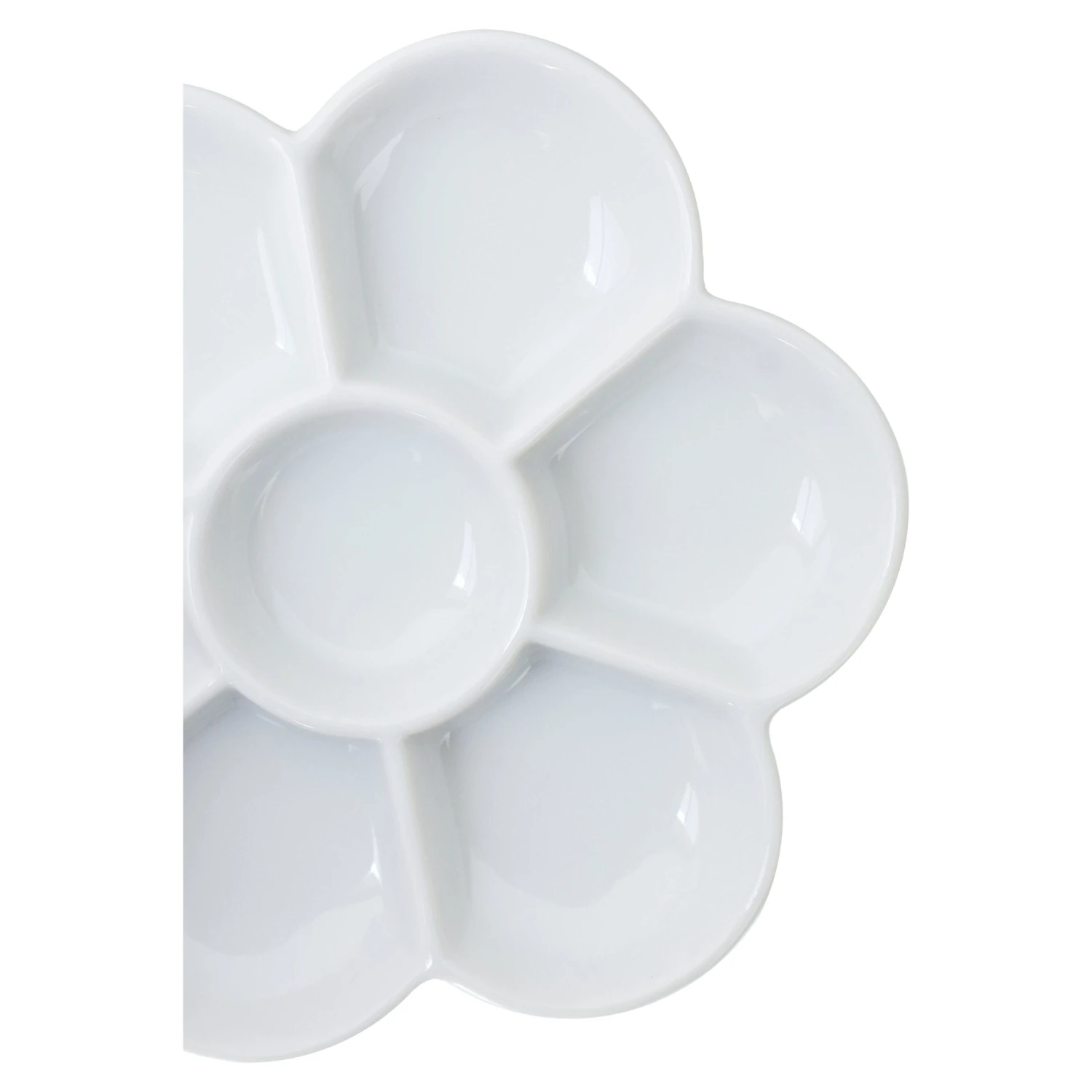 Yasutomo 7-Section Flower Porcelain Dish. Crafted from premium Japanese porcelain, this versatile dish boasts a 5-inch diameter and 5/8-inch depth. The Yasutomo 7-Section Flower Porcelain Dish provides ample space for your artistic endeavors.